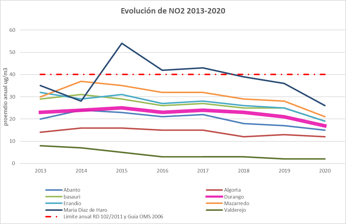 Respecto a la evolución del parámetro dióxido de nitrógeno (NO2) se aprecia que su nivel y su tendencia es como en otras estaciones urbanas de tamaño medio de Bizkaia, bastante mejor que en poblaciones de mayor tráfico.