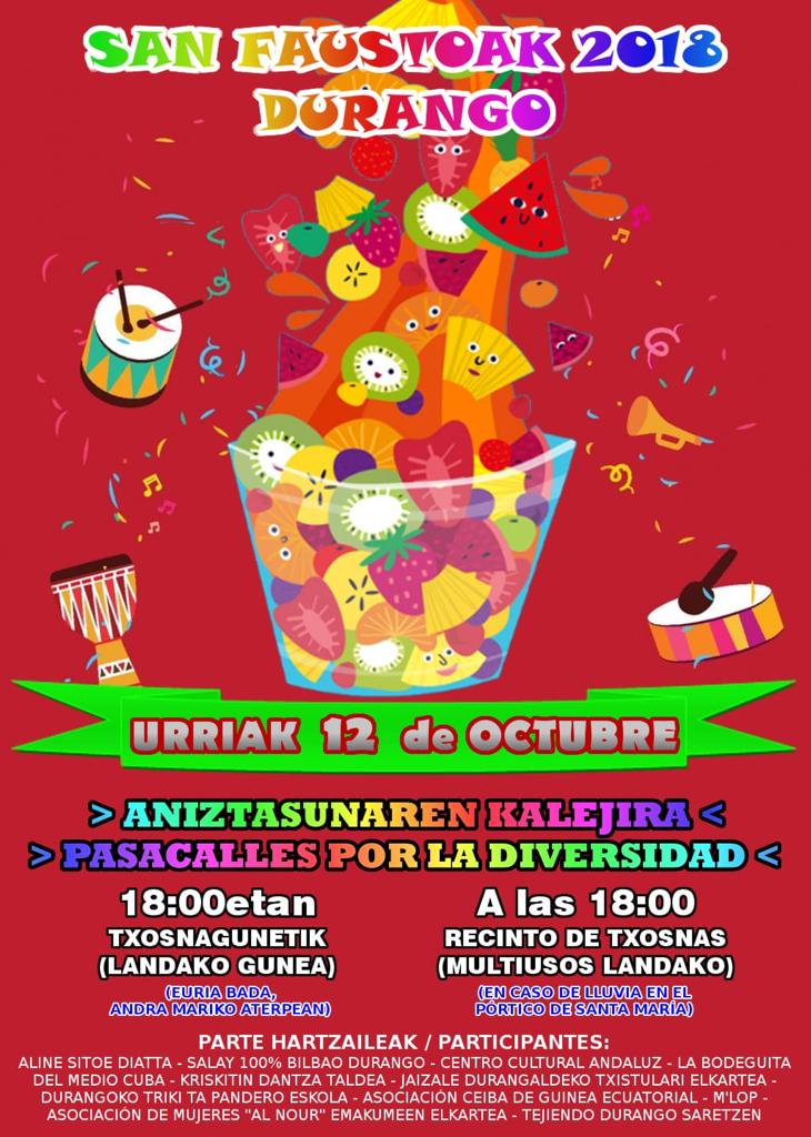 Con motivo del inminente inicio de los ‘Sanfaustos’, una docena de agrupaciones de Durango ha organizado para el próximo viernes, día 12, una kalejira a favor de la diversidad. El desfile comenzará a las 18.00 horas de los alrededores de Landako Gunea y, en caso de lluvia, se trasladará al pórtico de Andra Mari.