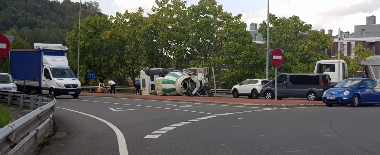 Un carril de la variante de Durango permanece cerrado al tráfico como consecuencia del accidente protagonizado por una hormigonera, que ha quedado volcada sobre la carretera por causas que se desconocen.