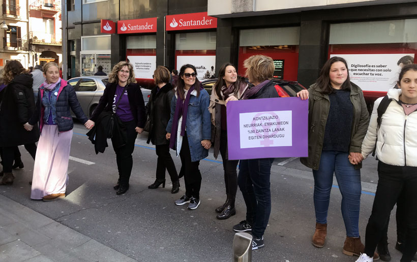 La huelga feminista se está dejando sentir con fuerza en Durango. Una impresionante cadena humana de mujeres ha unido las dos residencias públicas de Durango después del animado desayuno que se ha ofrecido a primera hora de la mañana en el pórtico de Andra Mari.